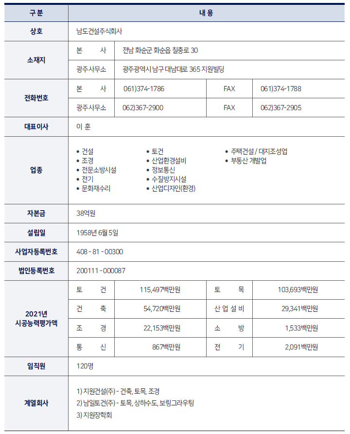 남도건설(주) ㅣ 대표이사 : 이 훈 ㅣ 주소 : 전라남도 화순군 화순읍 칠충로 30(본사) / 광주광역시 남구 대남대로 365 지원빌딩(광주지사)